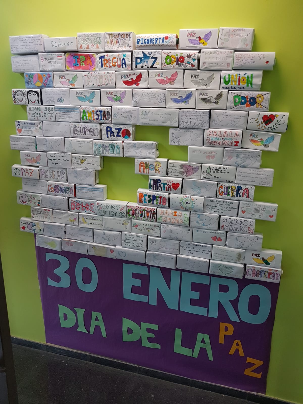 Actividad para trabajar en clase con el alumnado de los niveles básicos de enseñanza el día 30 de enero, día Escolar de la No Violencia y la Paz. Consiste en la realización de un muro construido con «ladrillos» de envase de tetrabrik los cuales irán decorados con una frase o con el nombre de una mujer que luchó por la paz. El objetivo es concienciar sobre la importancia de una convivencia armónica como pilar de una sociedad más justa e inclusiva, al mismo tiempo que visibilizar a mujeres que han luchado por esta causa.