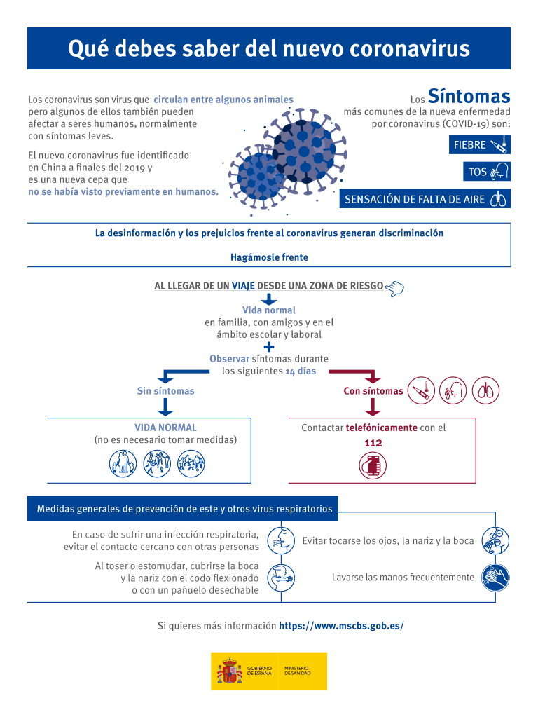 El Ministerio de Educación y Formación Profesional ha enviado a los Centros Educativos un texto y una infografía para su difusión, además de enlazar con la web del Ministerio de Sanidad que trata en tiempo real sobre el Coronavirus https://www.mscbs.gob.es/profesionales/saludPublica/ccayes/alertasActual/nCov-China/home.htm: