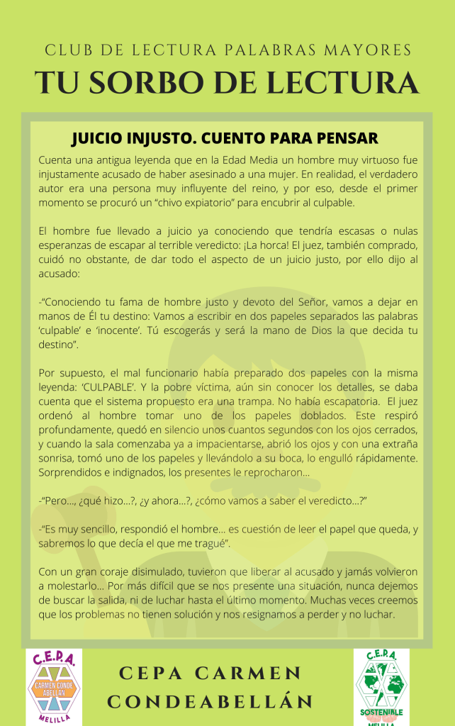 Proyecto del Club de Lectura del CEPA Carmen Conde Abellán. En este caso, traemos un cuento para pensar… ¿Y tú, qué hubieses hecho si te hubieses visto en el lugar del protagonista?