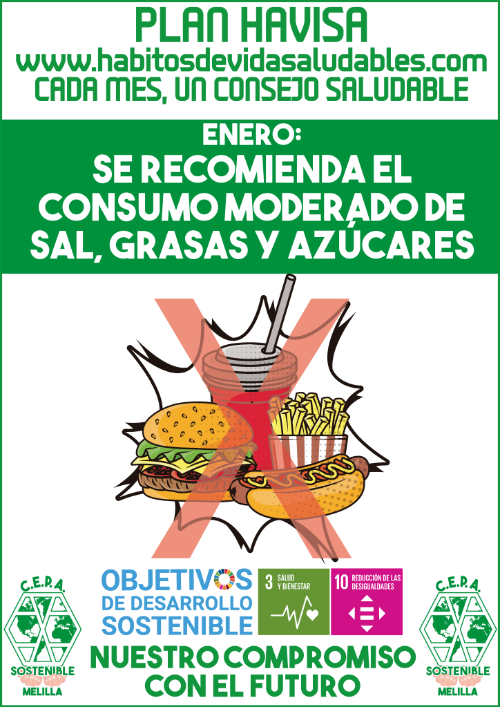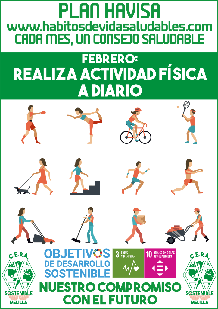 Desde el CEPA hemos asumido y difundido durante el primer semestre del curso los consejos del Plan HAVISA (Plan de Hábitos Saludables) de AECOSAN (Agencia Española de Consumo, Seguridad Alimentaria y Nutrición, promovida por el Ministerio de Sanidad, Servicios Sociales e Igualdad), que, en torno a dos ejes (uno, la alimentación equilibrada, variada y moderada, y otro, la práctica regular de la actividad física), promueve el conocimiento y difusión de un mensaje institucional mensual: